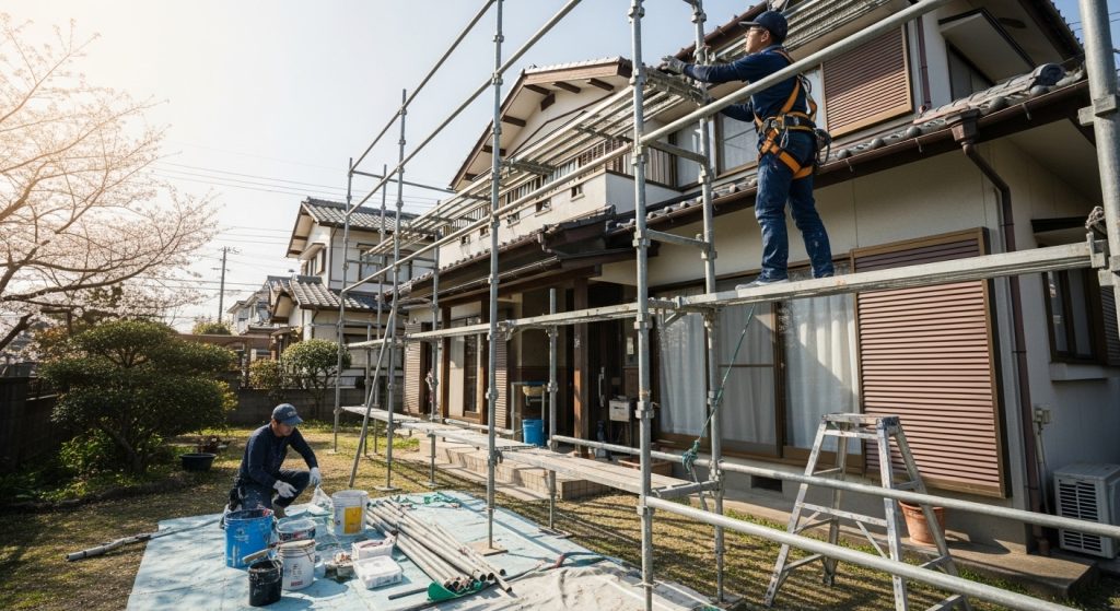 岐阜市で外壁塗装中のg様邸。玄関廻りはジョリパットで仕上げました。
