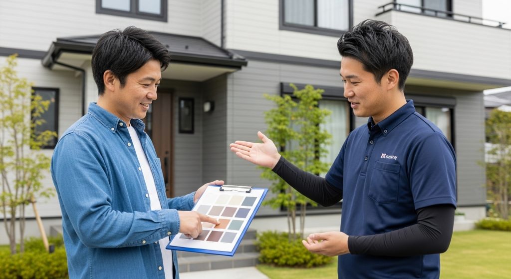 こちらは先週より新たに始まりました、o様邸です。外壁塗装工事をさせていただきます。施工前は念入りに打合せをします。木部は板金カバー工法で施工します。